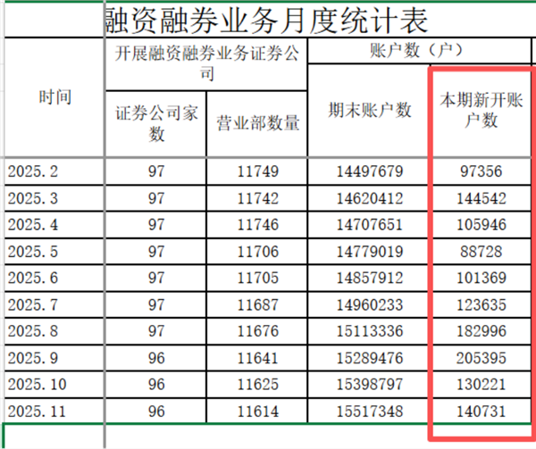 从2025年的月度数据明细来看,两融新开户数呈现明显的起伏:1月新开7万户;2月升至9.74万户;3月达到一个小高峰14.45万户;4月回落至10.59万户;5月进一步降至8.87万户;6月回升至10.14万户;7月继续增长至12.36万户;8月大幅跃升至18.3万户;9月则达到年内迄今的高点20.54万户,10月的回落至13.02万户,可视作在连续两个月高增长后的正常调整,而11月则反弹至14.07万户,整体仍处于今年以来中高位水平。