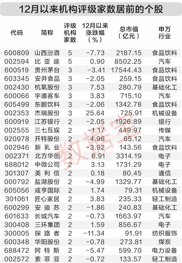 12月以来49家机构合计进行222次“买入型”(包括买入、增持、推荐、强烈推荐、强烈买入)评级,合计覆盖185股。