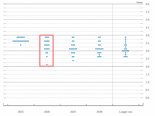 美联储12月利率决议宣布,降息25基点,联邦基金利率区间从3.75~4%下降至3.5~3.75%。点阵图显示,一位票委认为,2026还会降息一次;以为票委认为2026年利率将保持不变。大部分票委认为2026年将有可能加息。美联储理事米兰反对该决议结果,他认为降幅幅度应该在50基点。美联储理事古尔斯比和施密德认为,应当保持利率不变。其余9名票委均支持降息25基点的决定。