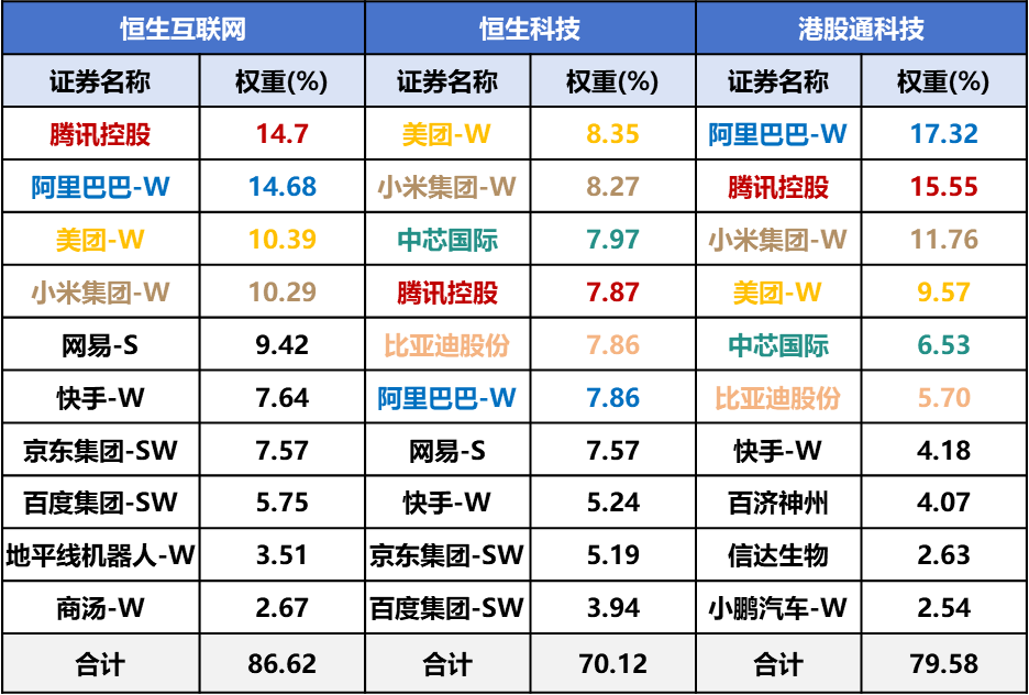 上述ETF跟踪指数不同,对港股科技AI巨头的权重分布也略有差异,其中港股通科技ETF基金(159101.SZ)单一个股权重上限更高,阿里巴巴+腾讯控股+小米集团+美团-W+中芯国际+比亚迪股份的合计占比近70%。