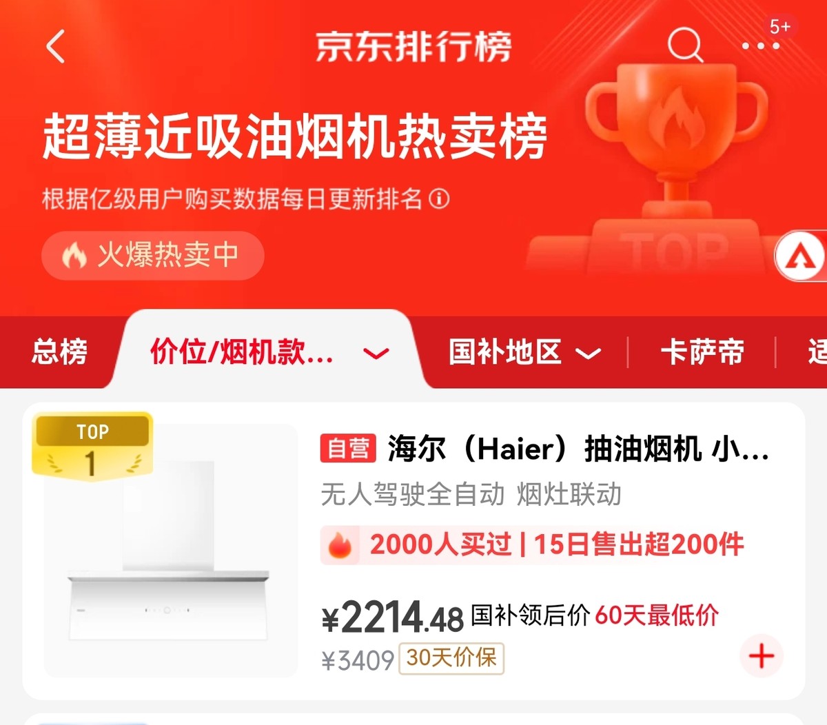 国庆、中秋双节前夕,AI厨电正成为行业新增长点。过去长期由传统品牌及“大风力”产品所主导的吸油烟机市场正迎来新的变革,以京东家电超薄近吸油烟机实时榜单为例,一款颠覆传统操作模式的海尔全自动油烟机连续多日占据榜单TOP1。