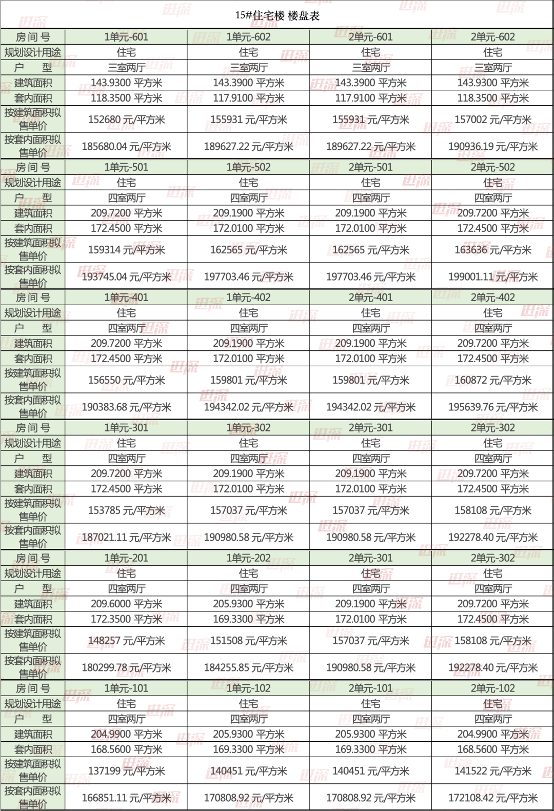 中间楼层均为210㎡四室两厅户型。