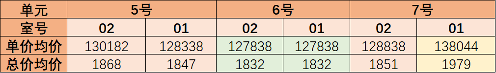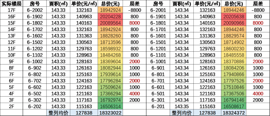 中间四户的均价在12.8万/㎡左右;相较于西侧边户,东侧边户采光面和视野都略胜一筹,所以均价最高,为138044元/㎡,西侧边户均价为130182元/㎡,总价差额约100-160万元。