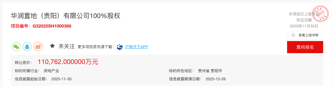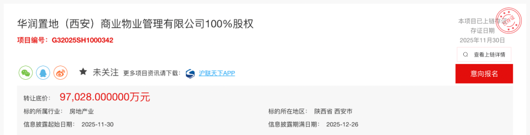 据上海联合产权交易所信息显示,11月30日,华润置地(西安)商业物业管理有限公司(下称“华润西安”)100%股权、华润置地(贵阳)有限公司(下称“华润贵阳”)100%股权公开挂牌转让,转让底价合计约20.78亿元,截止日期均为2025年12月26日。