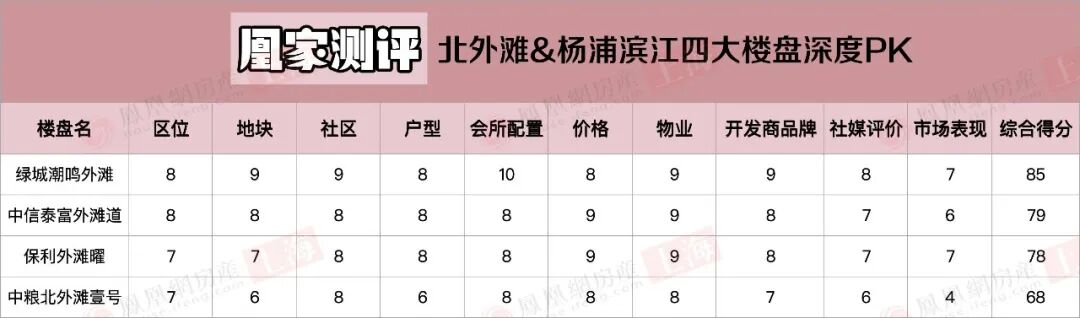 从综合得分排名来看,绿城潮鸣外滩以85分领先,中信泰富外滩道(79分)与保利外滩曜(78分)紧随其后,中粮北外滩壹号(68分)目前暂居末位。
