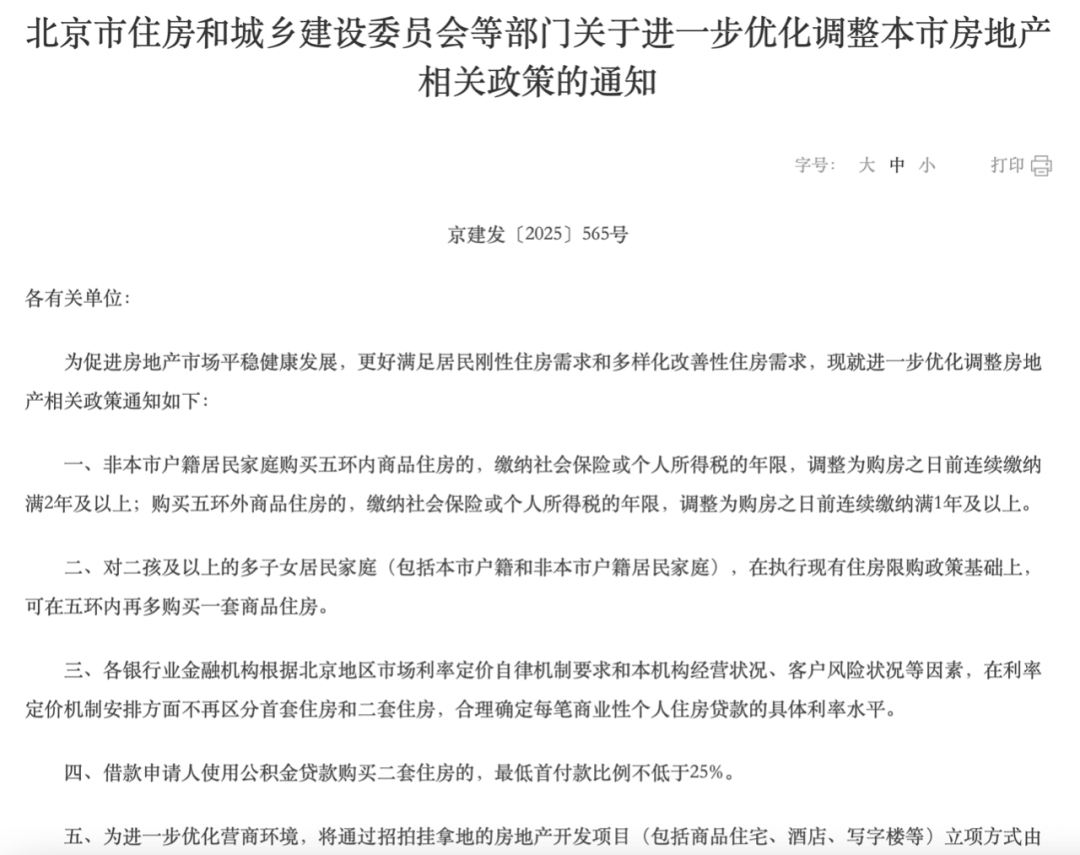 至此,北京成为全国住房城乡建设工作会议召开后首个优化房地产政策的一线城市,新政自2025年12月24日起施行。