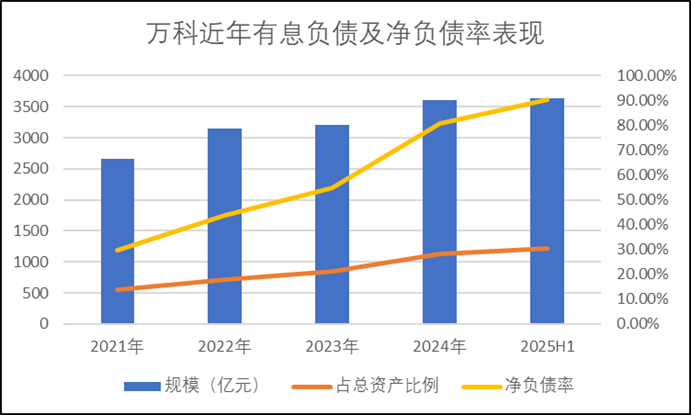 截止2025年上半年,万科有息负债规模升至3642.6亿元,占总资产比例达30.5%。分融资对象看,银行借款占比达72.5%,约2641.86亿元,是核心负债来源。同期,净负债率已升至90.4%水平。
