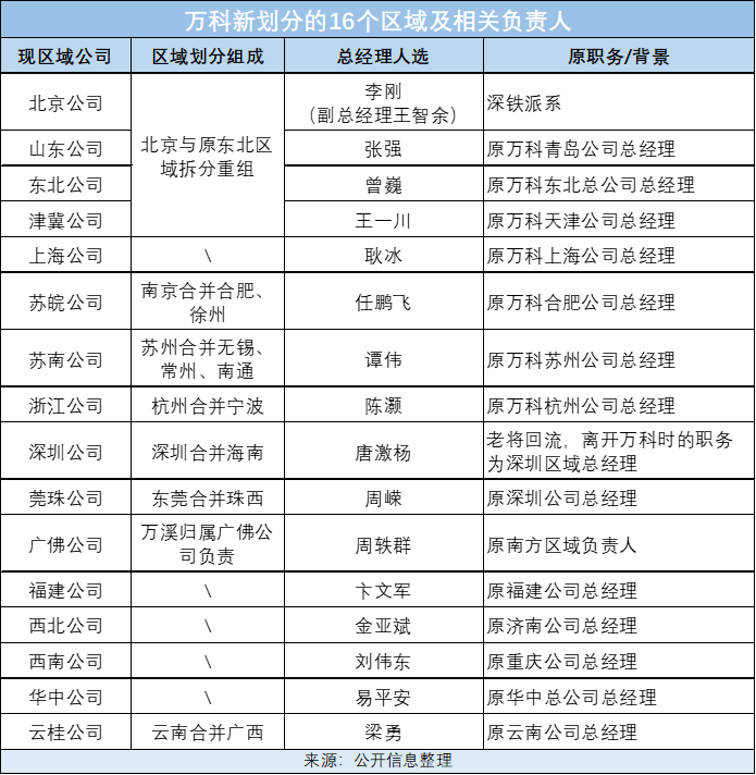 根据公开信息显示,在新16个区域中,总经理人选基本都是原万科人,且大部分都是平调,少部分区域是返聘老将。