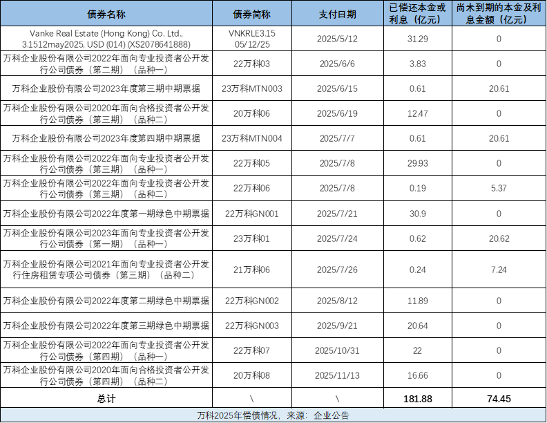 数据显示,2025年万科共有17笔到期或行权的境内公开债和1笔境外债到期,规模合计超360亿元。然而,截至2024年末,万科账上的货币资金难以覆盖到期债务规模。