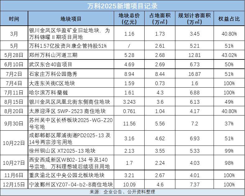 据市场公开信息统计,万科年内累计新增15个项目(2024年:13个),总计容建筑面积约98.72万平方米(2024年:137万平方米),权益计容面积约61.54万平方米(2024年:83.3万平方米),对应的权益地价为39.29亿元(2024年:55.6亿),以此计算,新增项目平均地价为6385元/平方米(2024年:6670元/平方米)。
