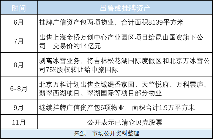 除了通过抵押换取“时间”,万科也在不断出售资产回笼资金。