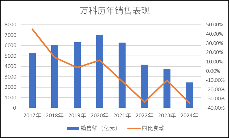 2017年时,万科销售额近5300亿元,后续在郁亮的带领下,公司销售一度突破7000亿大关。只不过随着房地产市场进入调整期,万科销售额也出现了较大程度的回调。