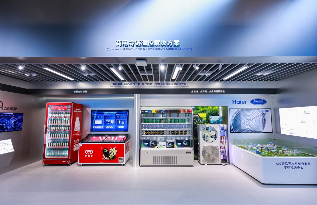 在“冰丝带”这样的顶级冰雪赛场,冰面硬度的毫厘之差与场馆运行的巨大能耗,是对制冷技术的双重极限考验。海尔开利深度助力的国家速滑馆二氧化碳跨临界直冷制冰系统,正是应对这一挑战的“绿色心脏”。该系统采用纯天然二氧化碳制冷剂,以接近4MW的最大制冷量,精准满足赛道对温度与稳定性的严苛需求。作为该技术首次在奥运场馆的大规模应用,全年可累计节能超200万度电,为“绿色奥运”树立了科技与生态融合的典范。与此同时,海尔商冷在食品饮料行业研发的立式冷冻无人售货柜能耗低于国家标准72%,已应用于多家企业。