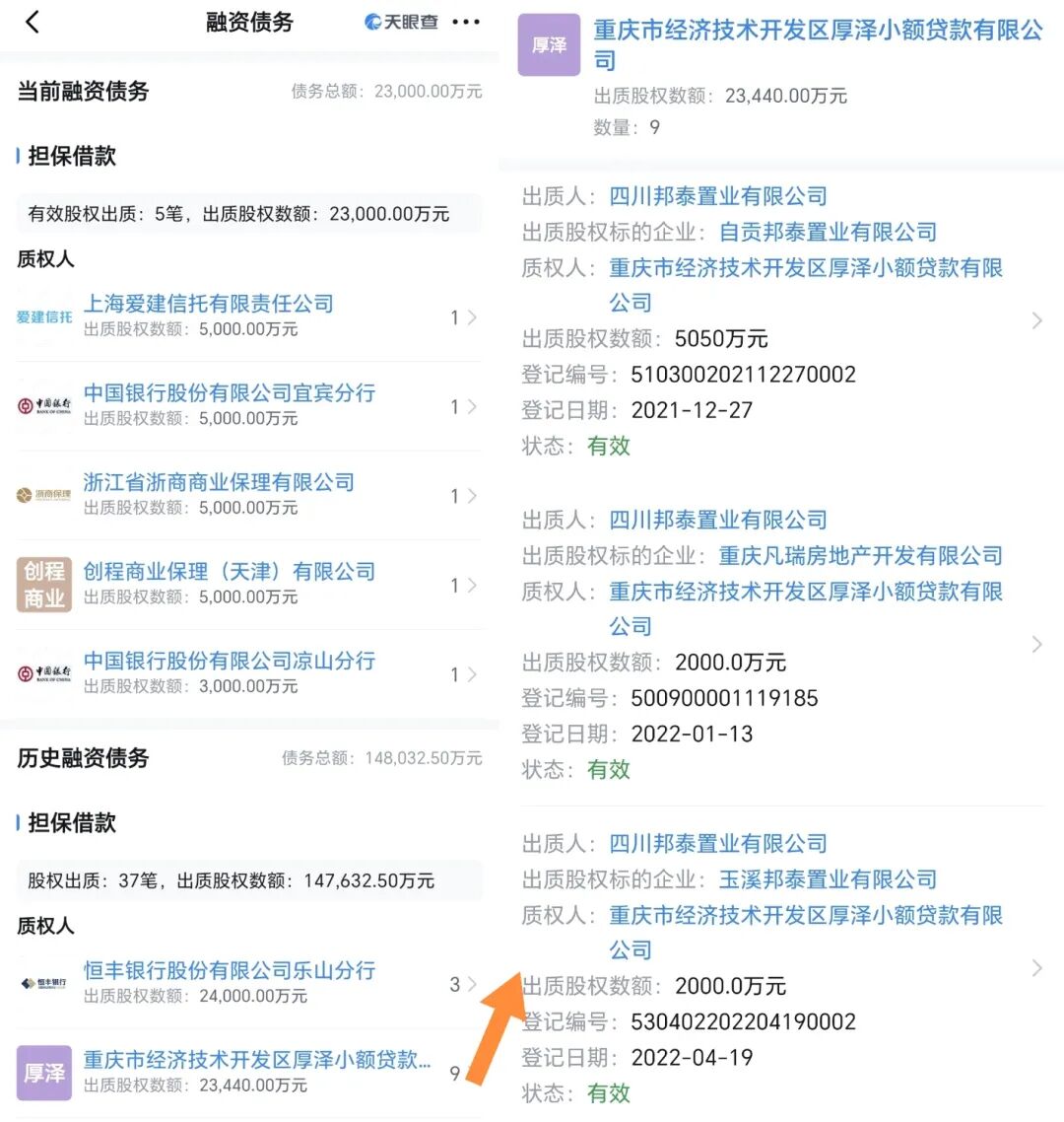 其中,2.3亿元当前抵押融资债务主要涉及三家子公司,合肥邦成和泰置业相应股权分别抵押给了爱建信托、浙商商业保理、创程商业保理,邦泰宜尚置业5000万股权抵押给中行宜宾分行,西昌邦泰置业3000万股权数额抵押给中行凉山分行。