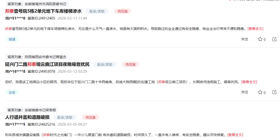 实际上,在人民留言板和问诊四川的最新投诉中,主要也是关于房屋质量的,例如四川邦泰开发的邦泰熙华天骄地下车库出入口安全隐患等等。值得一提的是,邦泰壹号院车库楼梯渗水、邦泰时代之光人形道路破损,这是安徽邦泰控股开发,两家企业无关。