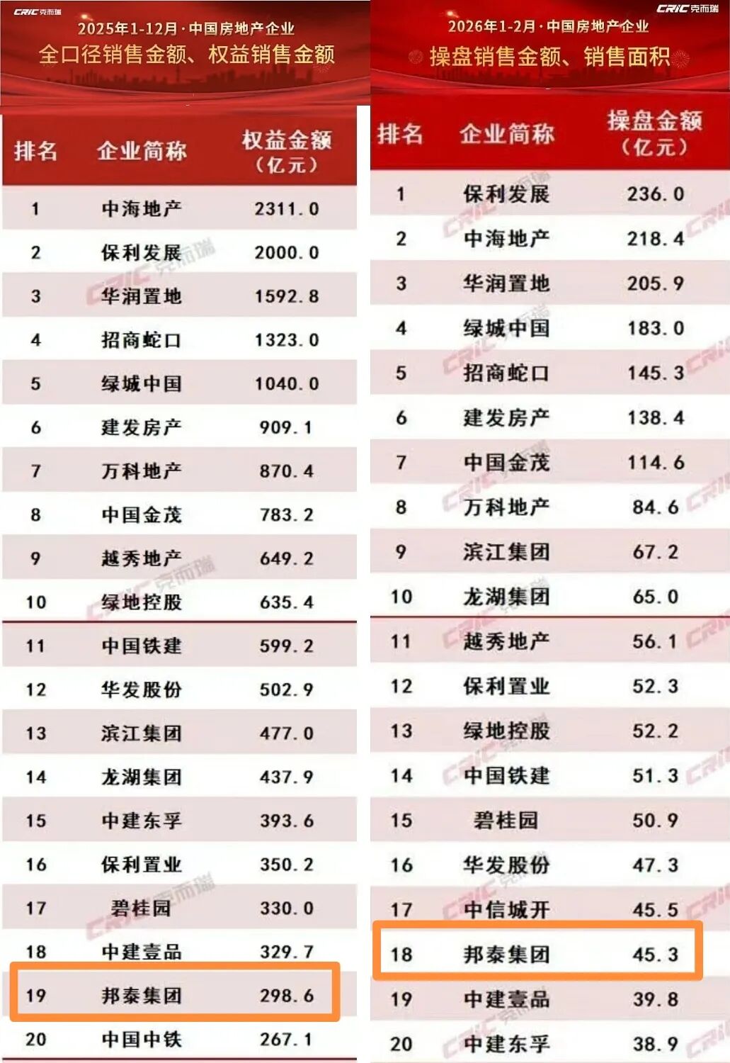 2026年1-2月,邦泰更是进一步冲到了全国房企操盘销售榜第18位,保持民营房企第4的位置。另外邦泰去年在房企权益拿地金额榜单中处于第13位。