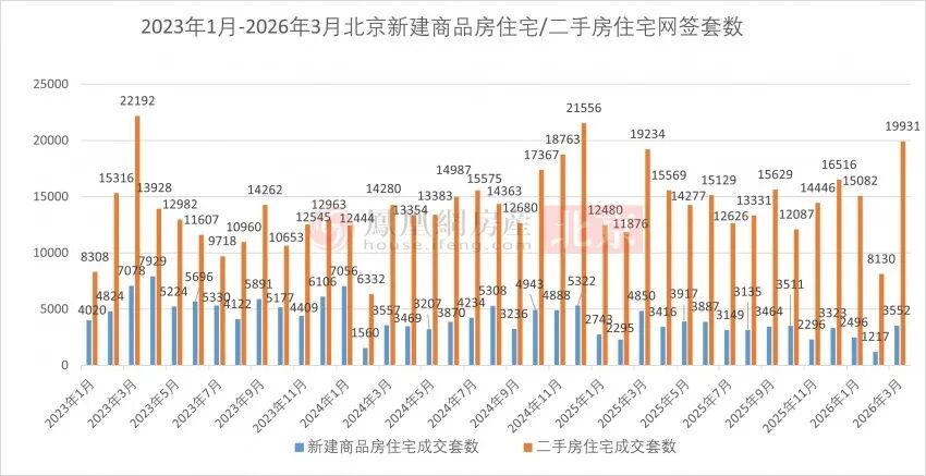 2023年1月-2026年3月北京新建商品房住宅/二手房住宅网签套数