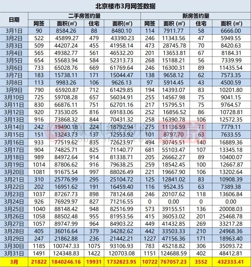 北京楼市3月网签数据详表