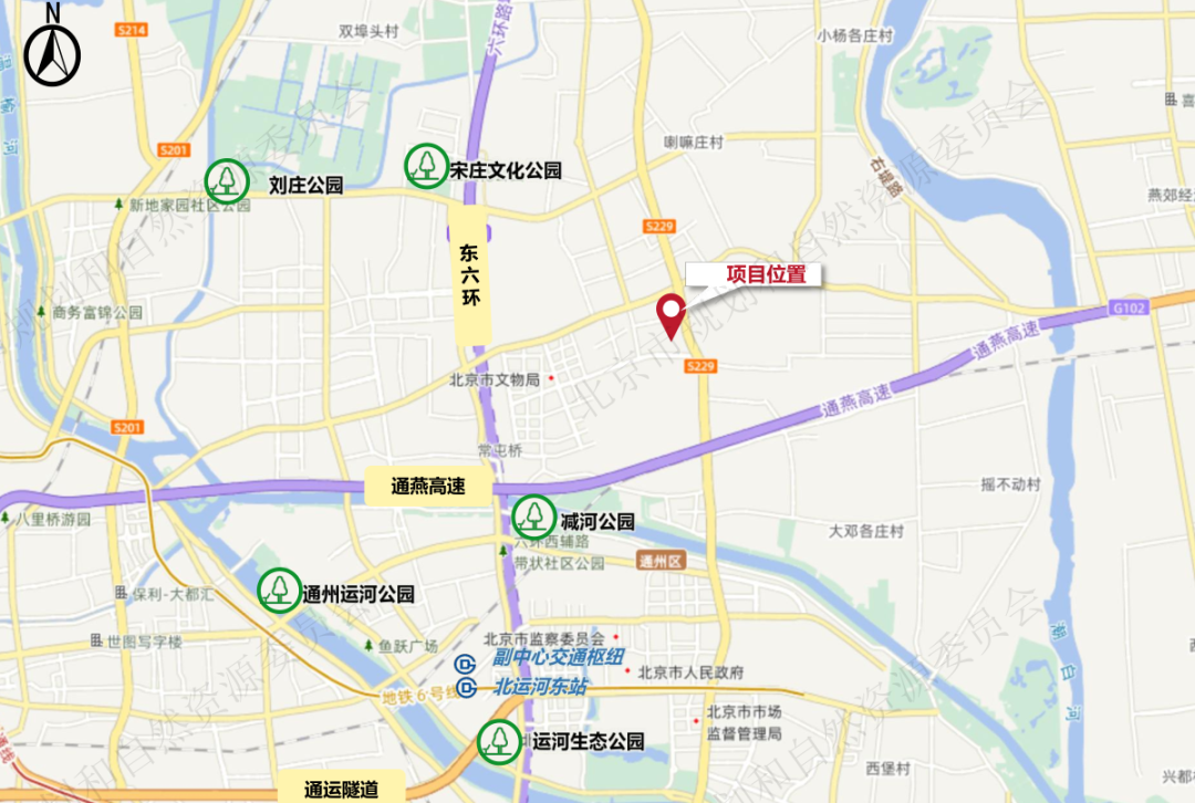 根据《“多规合一”协同平台审核意见函》,地块四至范围为:北至宋庄镇政府南街,南至宋庄中学中街,西至宋庄文化区四路,东至通怀路(规划路名以最终批复地名为准)。