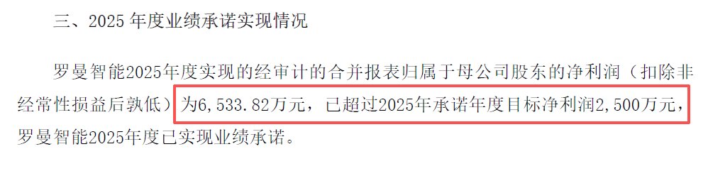 这背后还有2024年收购罗曼智能带来的协同效应。2025年,罗曼实现归母净利润(以扣除非经常性损益后孰低)6,533.82万元,以261%的完成率超额实现业绩承诺。
