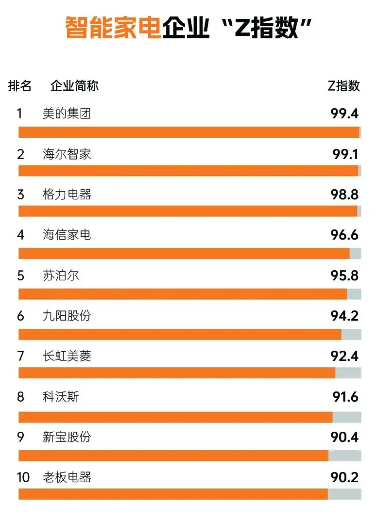 海尔智家企业“Z指数”紧随其后,为99.1。据悉,海尔智家凭借领先的用户洞察、丰富的品类覆盖,在智能 AI 算法、家庭大数据、设备物联技术等方面的积累,围绕家庭的“客厅、厨房、浴室、卧室、阳台”等五大空间,提供食品保鲜烹饪管理、衣物洗护穿搭管理、全屋空气舒适净化管理、饮用水健康管理等场景方案,为消费者“设计一个家、建设一个家、服务一个家”。