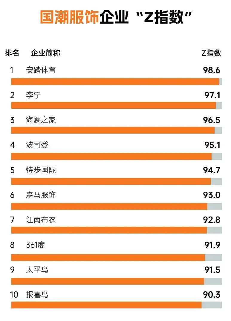在国潮服饰领域,安踏体育企业“Z指数”位居榜首,达到98.6。据悉,安踏体育作为中国体育用品行业领导品牌,为消费者提供具功能性、专业及科技驱动的体育用品,还作为中国奥委会合作伙伴,持续为22支中国国家代表队提供运动装备。今年上半年,安踏体育抓紧“双奥”催化品牌升级所带来的机遇,竭力深化品牌在消费者心目中与奥运及中国奥委会的关联度,并继续与谷爱凌、武大靖及张继科等运动员合作,推广品牌的专业形象,同时通过顶流明星王一博、白敬亭及关晓彤等强大的影响力,吸引中国的年轻消费者。