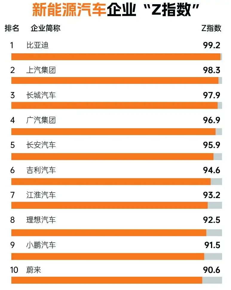 上汽集团企业“Z指数”紧随其后,为98.3。上汽集团基于自主掌控的新一代“三电”、燃料电池、智能驾驶等核心技术,打造了“星云”纯电专属系统化平台、“珠峰”机电一体化整车架构、“星河”电氢一体化整车架构,以及“蓝芯”动力总成系统、“魔方”平台化电池系统、“绿芯”电驱动系统、“银河”全栈智能车解决方案等七大技术底座,为公司电动智能网联产品持续赋能。