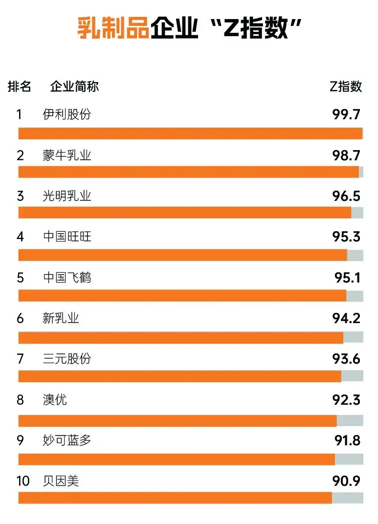 蒙牛乳业企业“Z指数”位居第二位,达到98.7。蒙牛乳业今年上半年特仑苏和蒙牛纯牛奶及每日鲜语鲜牛奶保持强劲增长、低温业务持续占据领先地位并获取市场份额;冰淇淋四大品牌随变、绿色心情、冰+及蒂兰圣雪聚焦产品创新升级、渠道掌控力强化,推动冰淇淋销售实现跑赢行业的快速增长。