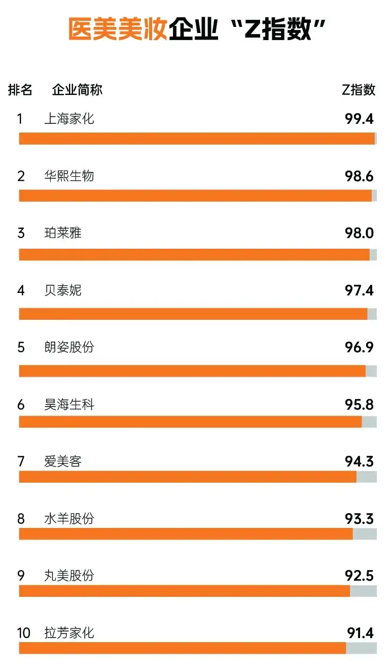 华熙生物企业“Z指数”位居第二位,达到98.6。据悉,华熙生物是全球知名的集研发、生产和销售于一体的透明质酸全产业链平台企业,拥有全球领先的微生物发酵生产透明质酸技术,透明质酸产业化规模位居国际前列。透明质酸具有良好的保水性、润滑性、黏弹性、生物降解及生物相容性等物理生物特性,在医疗、化妆品和功能性食品领域有着广泛的应用。