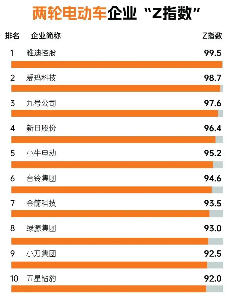在两轮电动车领域,雅迪控股企业“Z指数”位居首位,达到99.5。据悉,雅迪控股今年上半年继续推动广受欢迎及性能优异的冠能2.0及3.0系列以及领跑系列等热门电动两轮车系列的销售,该系列电动两轮车的销量领先于其他产品系列,占电动两轮车总销量的比例高达40%。未来,雅迪控股也将继续投资开发新车型,同时升级现有电动两轮车及电动自行车车型的性能。
