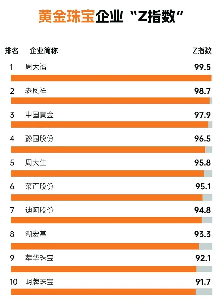 中国黄金企业“Z指数”位居第三位,为97.9。据悉,中国黄金不断探索“文化+”战略,深耕研发创新,打造卓越的产品赋能品牌发展;联手小米有品推出“金扣扣”试水“文化+科技”产品模式,将黄金元素与科学技术巧妙融合,丰富了公司产品品类和内涵;在神州十三号返航之际联合中国航天系统科学与工程研究院、中国航天基金会推出“为你摘星”等系列相关主题产品,提升品牌价值。