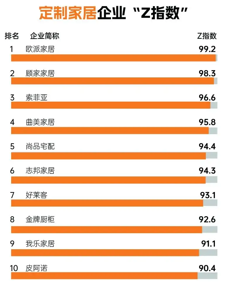 在定制家居领域,欧派家居企业“Z指数”位居首位,达到99.2。据悉,2021年,欧派全屋定制(衣柜)突破性提出高颜整家定制概念,引爆行业革命,让整家定制迅速成为家居行业新风口,众多行业内外厂商纷纷入局。今年上半年,原整装大家居“星之家”品牌焕新为“铂尼思”,实现了品牌、业务模式、产品的全面升级,提出“一站式超级集成服务商”的愿景,满足消费者对于整体家居生活方式的购买需求。
