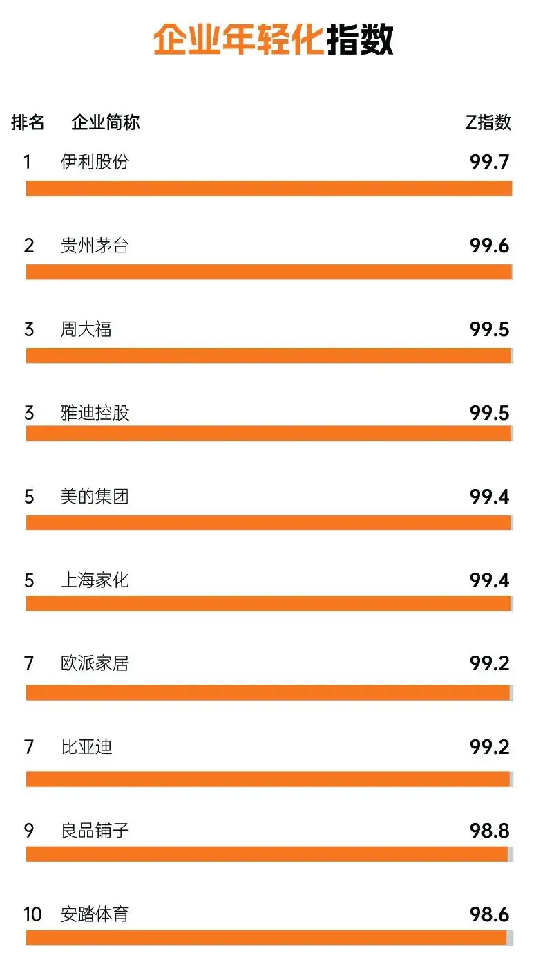 基于上述对国潮服饰、黄金珠宝、医美美妆、休闲食品、乳制品、酒水、定制家居、智能家电、两轮电动车、新能源汽车等10个最受Z世代群体关注的细分行业企业“Z指数”分析,《消费者报道》综合推出大消费领域企业年轻化指数。其中,乳制品企业伊利股份以99.7的“Z指数”位居第一;酒水企业贵州茅台以99.6的“Z指数”紧随其后,位居第二;黄金珠宝企业周大福和两轮电动车企业雅迪控股均以99.5的“Z指数”并列第三。