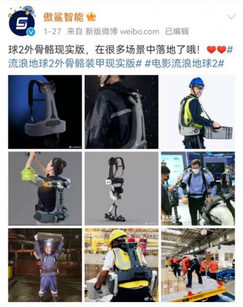 电影中多处出现外骨骼,有工人建设时的工程外骨骼、辅助军人工作的特种外骨骼等,应该是《流浪地球1》中外骨骼的前代产品。这一设定,让电影充满了赛博朋克式的幻想。实际上,这并不是特效,而是由品牌傲鲨智能的赞助改装而成。根据品牌微博,这些外骨骼已经在很多场景中落地。有些产品能够提供30公斤助力,综合减负60%以上。