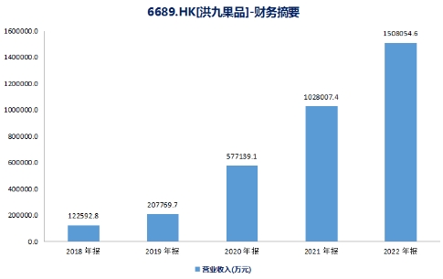 在积极的“端到端”战略布局下,2018年-2022年,洪九果品年化营收复合增速87.3%。洪九果品营收复合增速表现远好于业内同行。