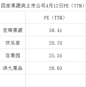 截止4月12日收盘,洪九果品的PE(TTM)仅为20.03倍,低于A股上市果蔬生鲜类公司宏辉果蔬的59.41倍和欢乐家的28.78倍,也低于同在港股上市的百果园的25.35倍PE。