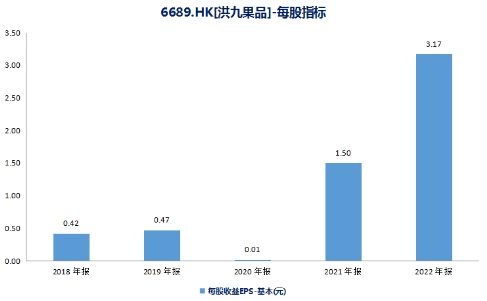 净利润方面,2021至2022年,洪九果品经调净利润由10.89亿元增长至14.54亿元。盈利表现持续高光表现带动洪九果品每股EPS从1.5港元/股翻倍增长至3.17元/股。