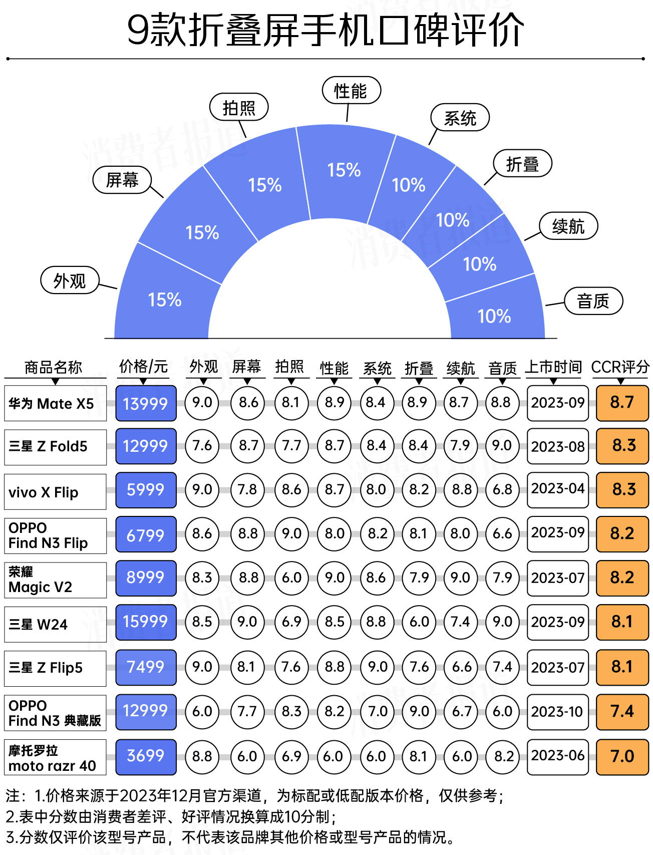 结果显示,9款折叠屏手机中,华为折叠屏手机较受消费者认可,其中华为 Mate X5、三星 Z Fold5的CCR评分分别高达8.7、8.3分。