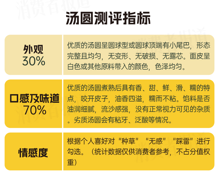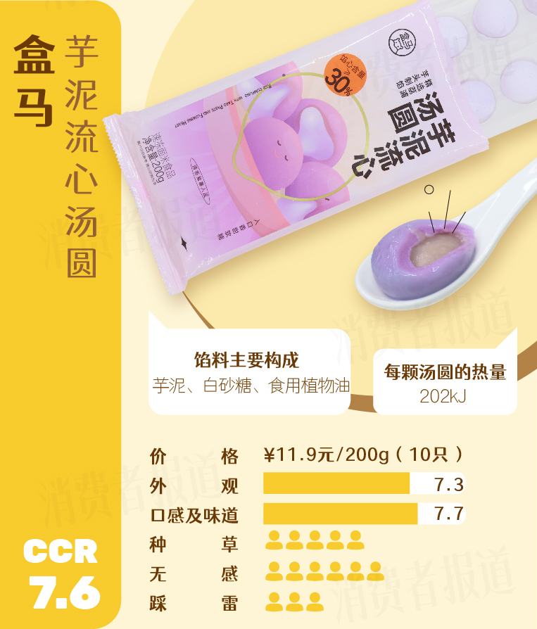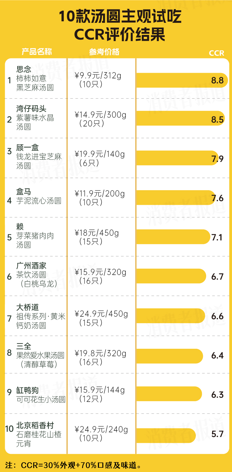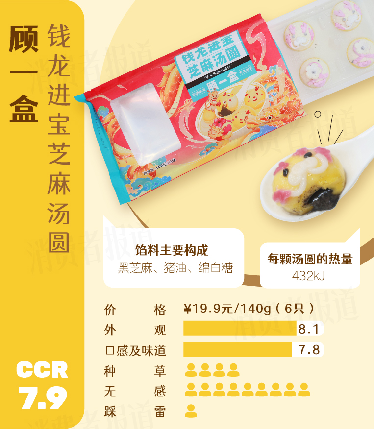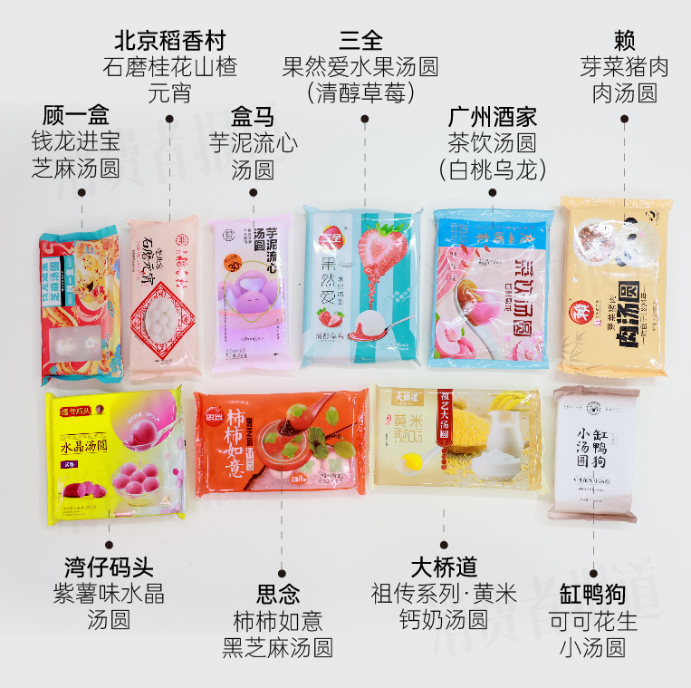 顾一盒钱龙进宝芝麻汤圆、盒马芋泥流心汤圆、思念柿柿如意黑芝麻汤圆、湾仔码头紫薯味水晶汤圆、广州酒家茶饮汤圆(白桃乌龙)、缸鸭狗可可花生小汤圆、赖芽菜猪肉肉汤圆、三全果然爱水果汤圆(清醇草莓)、大桥道祖传系列·黄米钙奶汤圆、北京稻香村石磨桂花山楂元宵