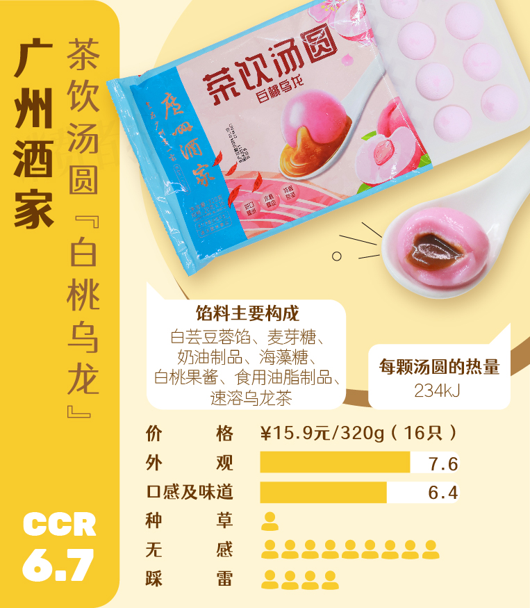 CCCC:汤圆皮有点沙沙的感觉,没有很细腻,白桃乌龙的味道很足,但感觉像香精味,有点发苦。