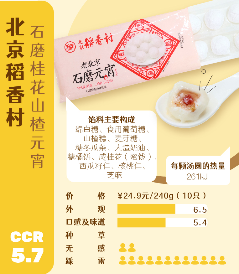 汤圆是“包”出来的,元宵是“滚”出来,北京稻香村石磨桂花山楂元宵是一款混进汤圆里的元宵,在10款汤圆中俨然一个“显眼包”。高情商:有一种浑然天成的手工痕迹;低情商:疙里疙瘩。