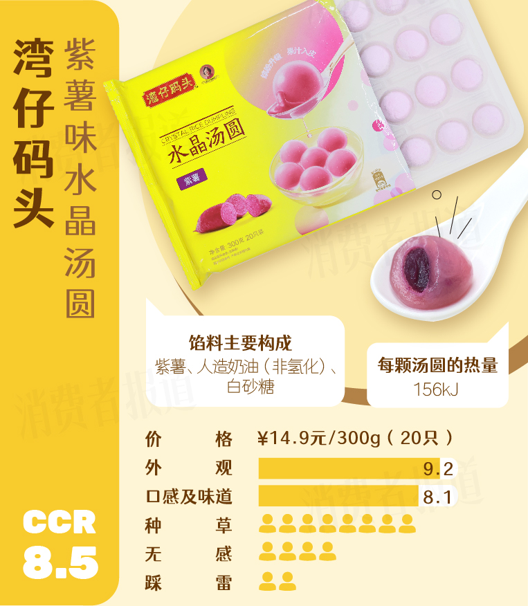 CCCC:煮完有点大只,一口吃有点勉强,有一点粘喉咙,奶黄味很足,略甜。