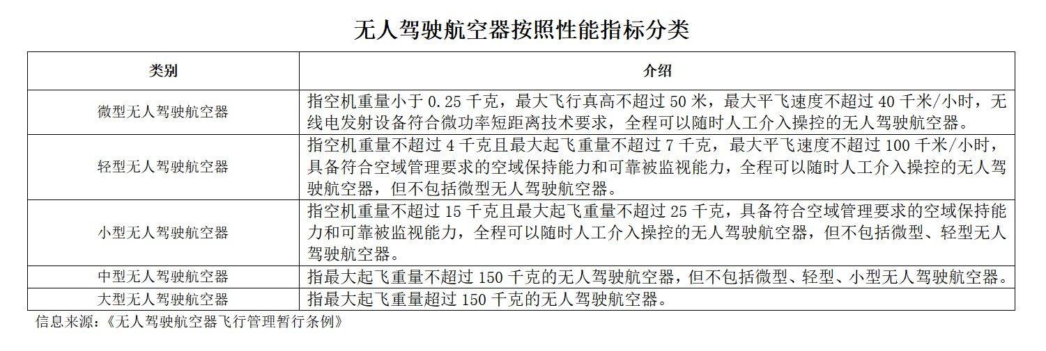 值得关注的是,条例中对无人驾驶航空器按照性能指标分成了微型、轻型、小型、中型、大型共5类。