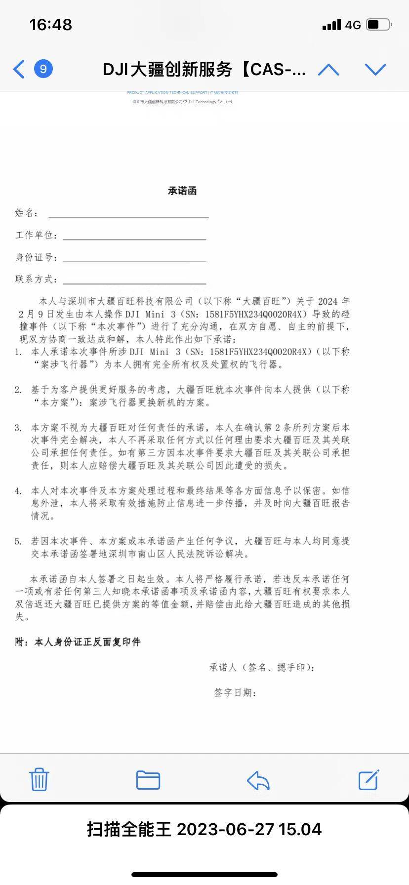 张先生向记者出示大疆提供其签署的承诺函