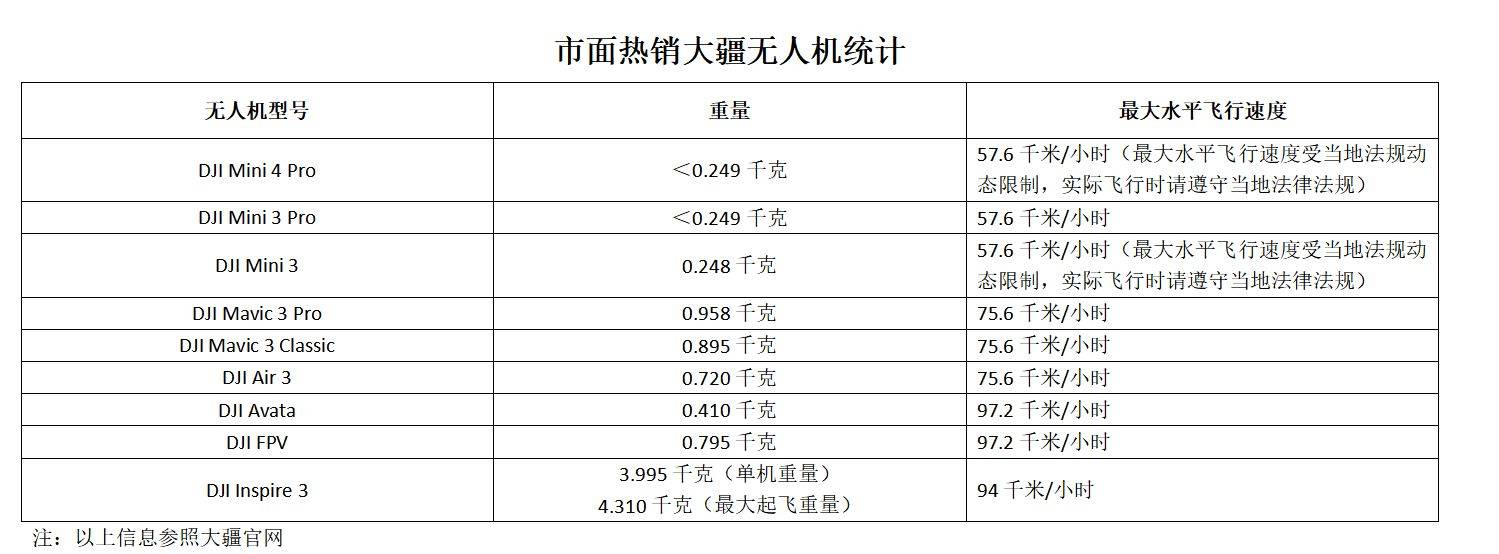 记者对市面热销的大疆无人机重量以及最大水平飞行速度进行了统计,发现除了mini系列属于微型外,其他系列均属于轻型。