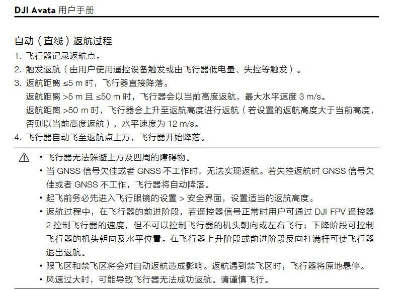 根据大疆Avata用户手册对自动返航的描述,当返航距离大于50米时,飞行器会上升至返航高度进行返航(若设置的返航高度大于当前高度,否则以当前高度返航),水平速度为12m/s。注意事项中也提及飞行器无法躲避上方及四周的障碍物。