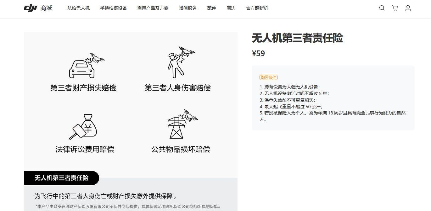 记者在大疆官方商城中注意到,大疆有为消费者提供付费增值服务“随心换”,一般包含低价置换(限次数)、飞丢/进水/跌落保障、一定额度三者险等权益。另外,大疆公关部也向记者展示了官方商城购买第三者责任险的入口。该责任险为飞行中的第三者人身伤亡或财产损失意外提供保障,主要包括第三者财产损失赔偿、第三者人身伤害赔偿、法律诉讼费用赔偿、公共物品损坏赔偿。