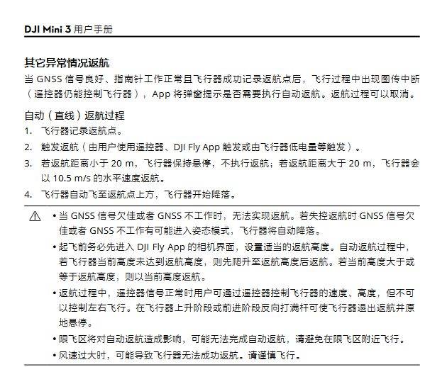 针对大疆Mini 3无人机的失控返航情况,大疆客服回复记者称,在DJI Fly中可将遥控器信号中断后的飞行器行为设置为返航、降落或悬停。若设置为降落或悬停,飞行器不会执行失控返航。若设置为返航,当GNSS信号良好、指南针工作正常且飞行器成功记录了返航点,当飞行器和遥控器信号中断11秒或以上,飞行器进入失控返航。大疆Mini 3用户手册中提及限飞区将对自动返航造成影响,风速过大也可能无法成功返航。