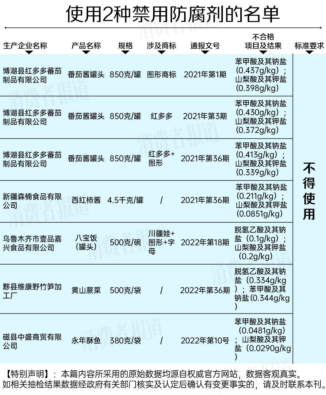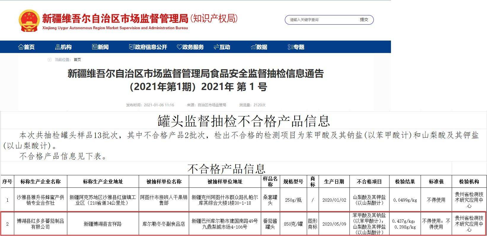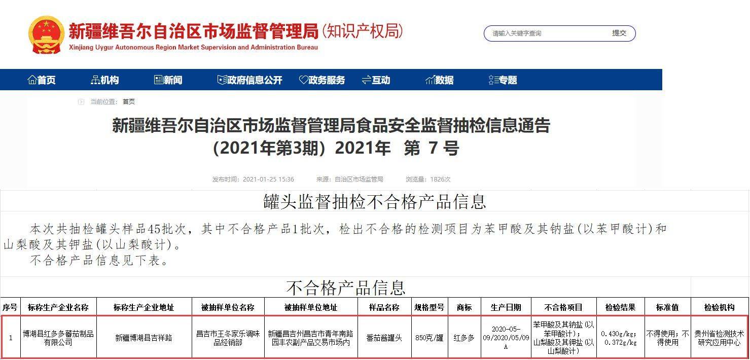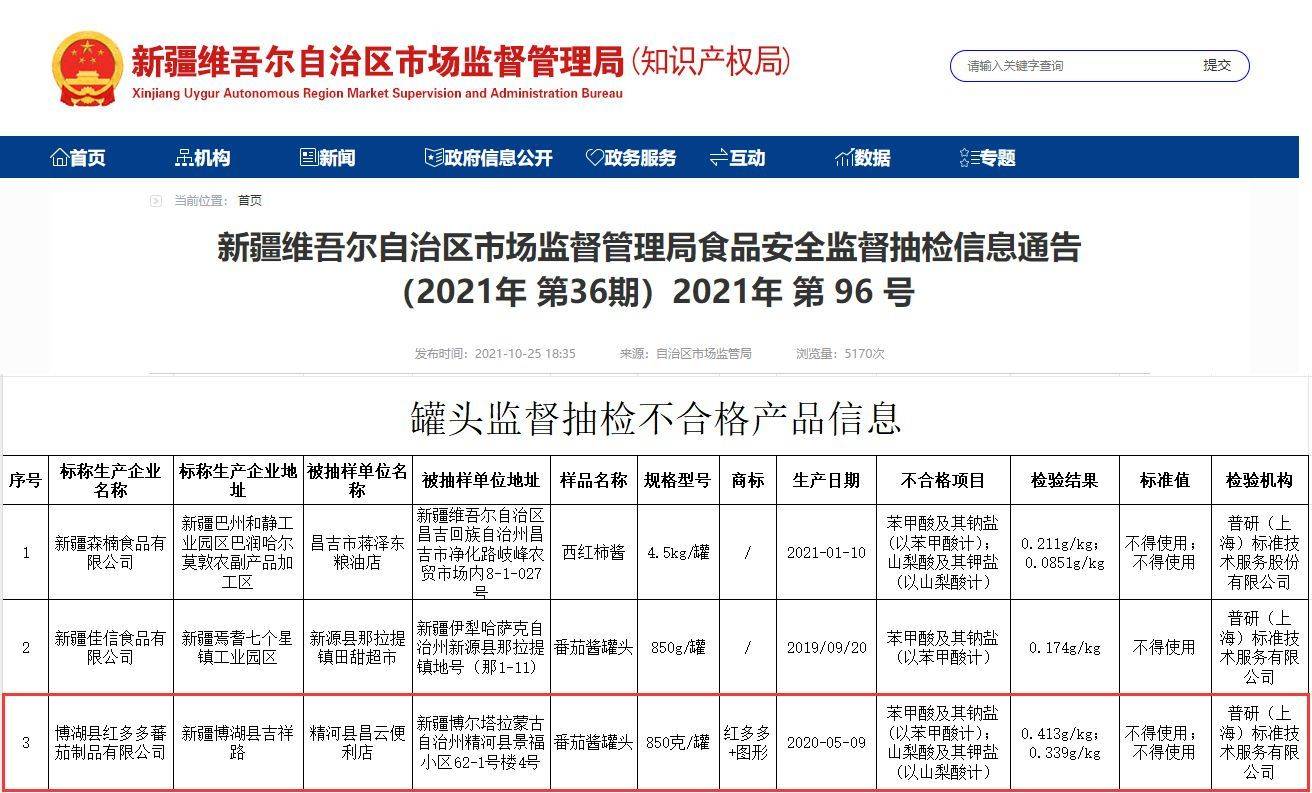 其中,标称由博湖县红多多蕃茄制品有限公司生产的番茄酱罐头曾3次上榜,均为同时违规使用苯甲酸及其钠盐、山梨酸及其钾盐。