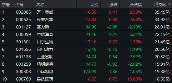 沪深两市半日成交额5466亿,较上个交易日同期缩量810亿。个股方面,万丰奥威成交额39.49亿元居首,长安汽车成交额同样超30亿元,赛力斯、中信海直、川宁生物、宗申动力、工业富联成交额均超20亿元。